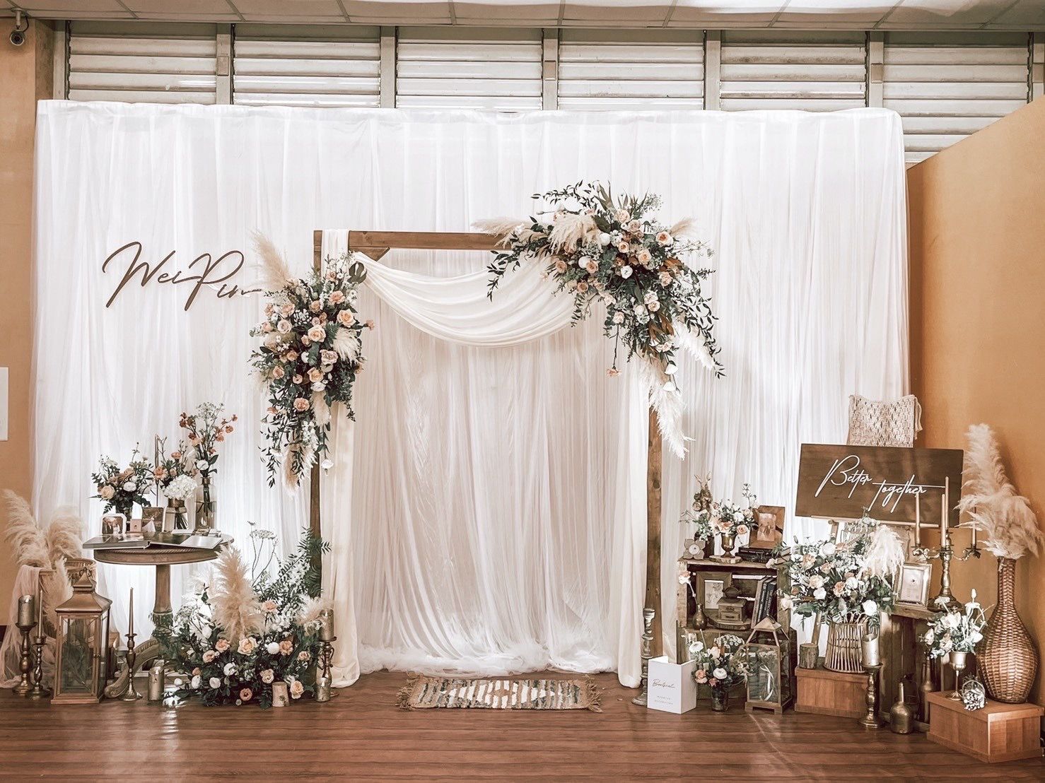 可以透過燈紗前的花藝或是懸吊花藝來規劃整體佈置
